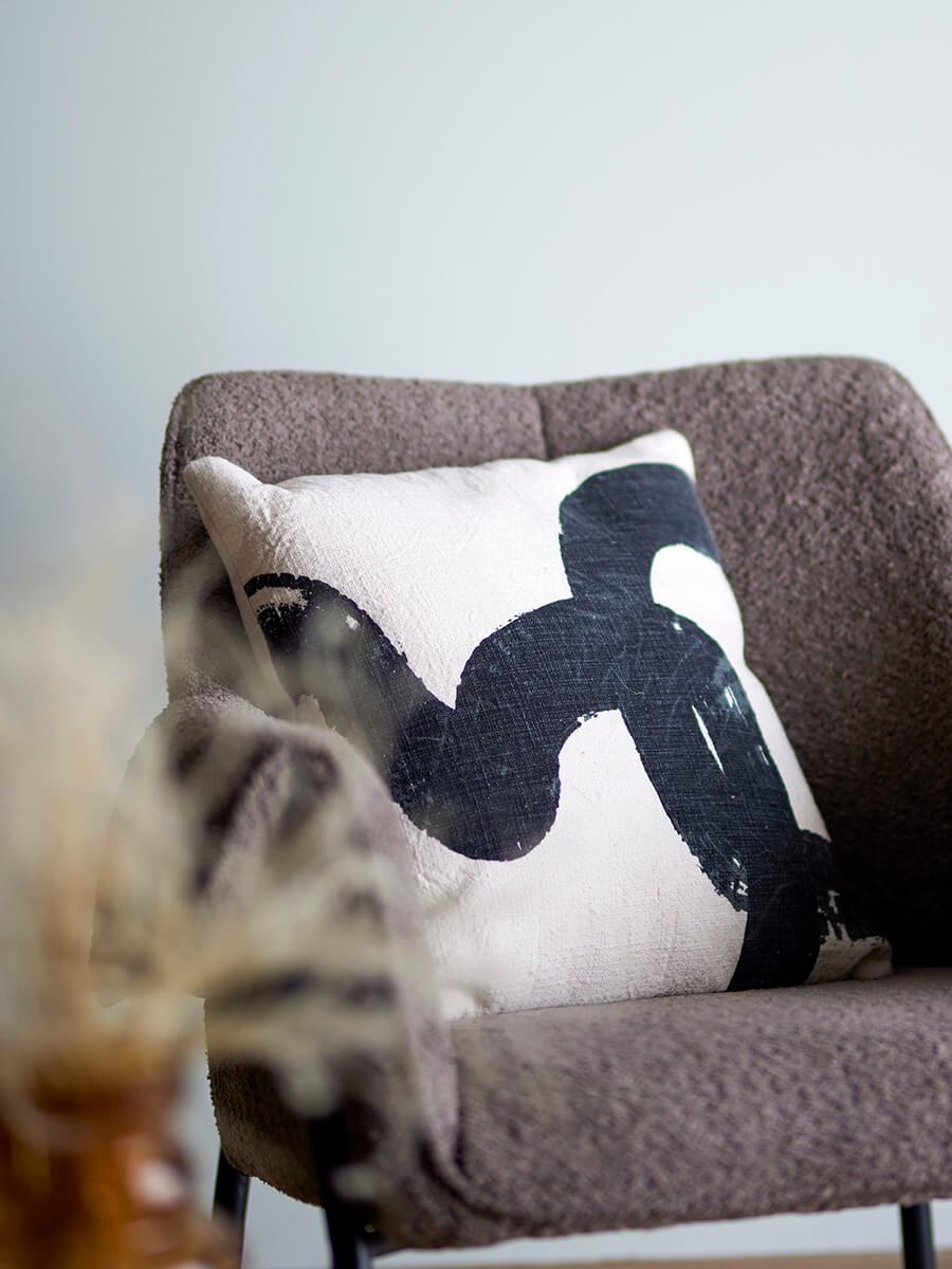 Bílý polštář tkaný z bavlny a potištěný vzorem připomínajícím tahy štětcem v černé barvě.