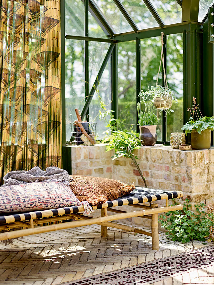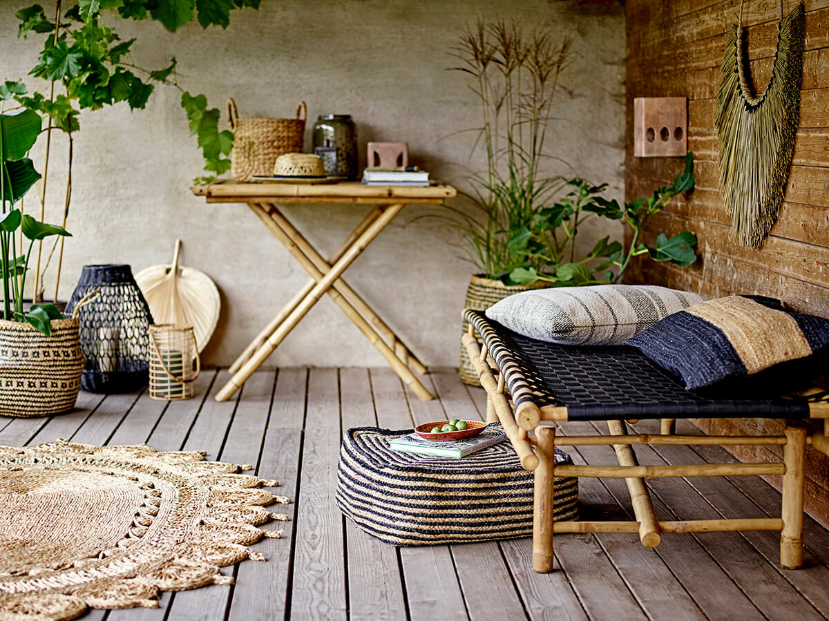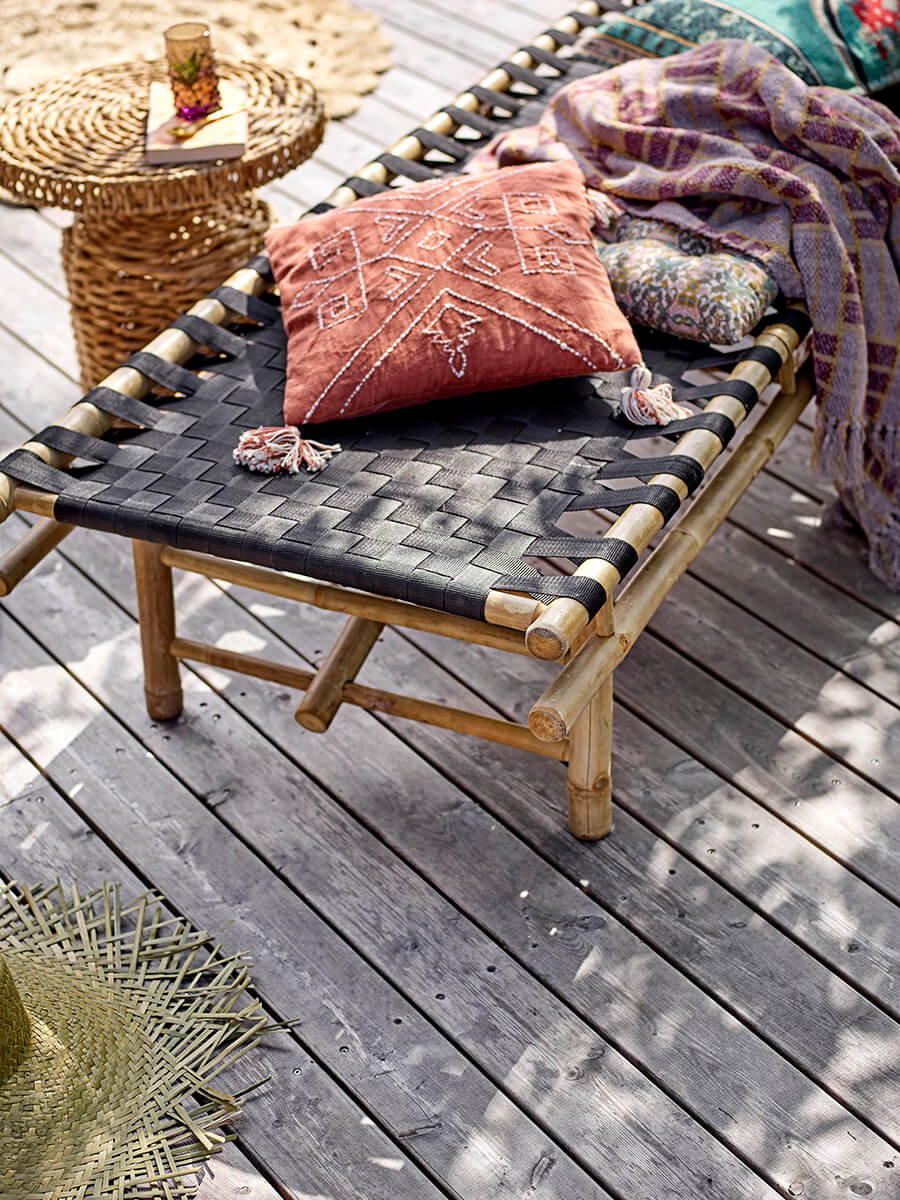 Denní lůžko Bloomingville z bambusu se sedákem z černého polyesteru, který je na lavici ručně vetkán. Použijte ji na balkoně, malé terase nebo na zahradě. Doporučujeme ji umístit do krytého prostoru.