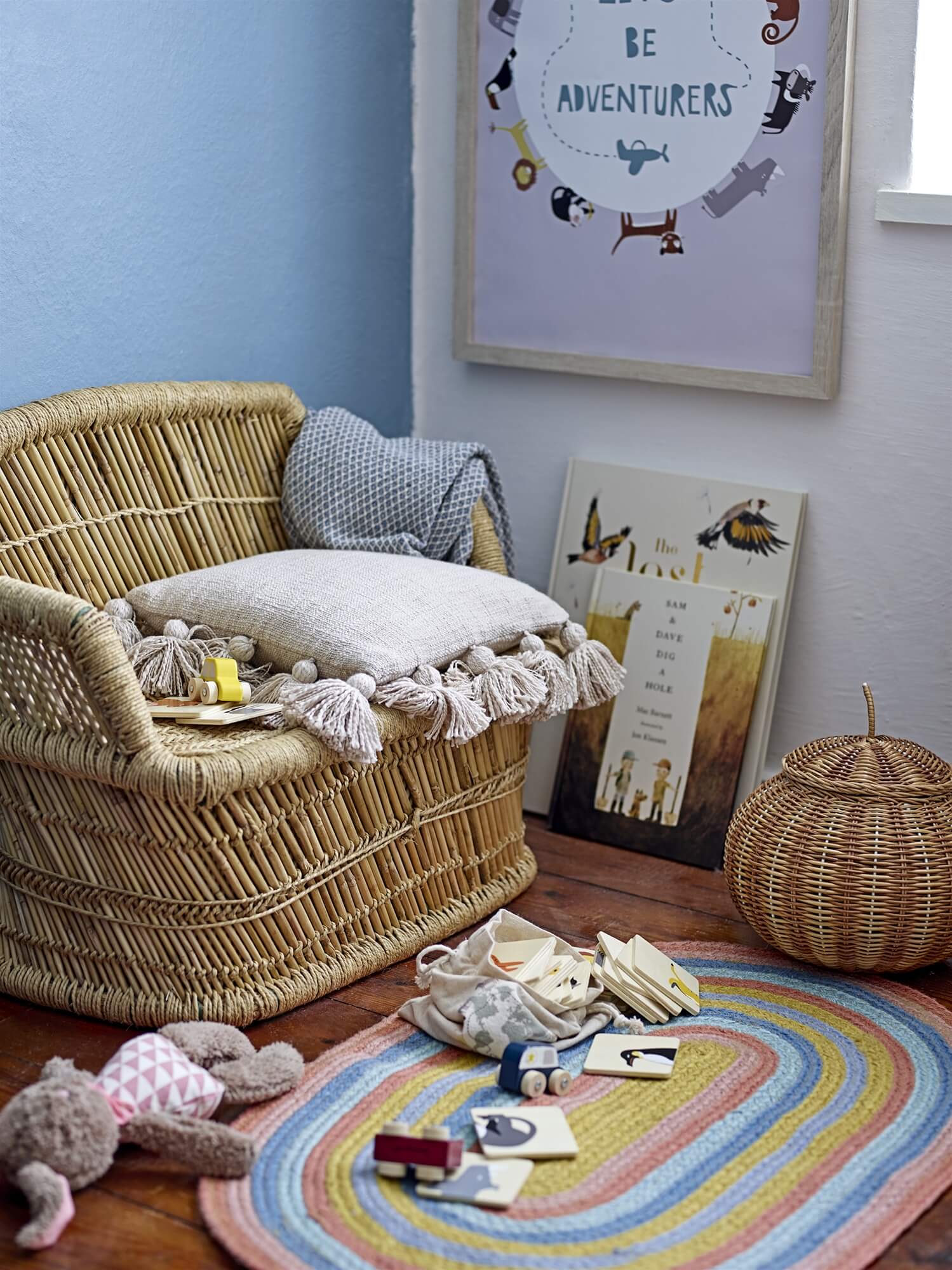 Veselý koberec s duhovým vzorem do dětského pokoje, vyrobený z přírodní juty.