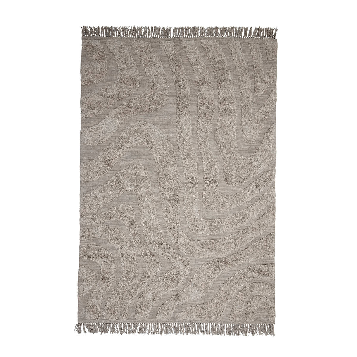 Koberec ručně tkaný z bavlny v přírodní barvě, který má krásný všívaný vzor vyrobený v různých délkách.