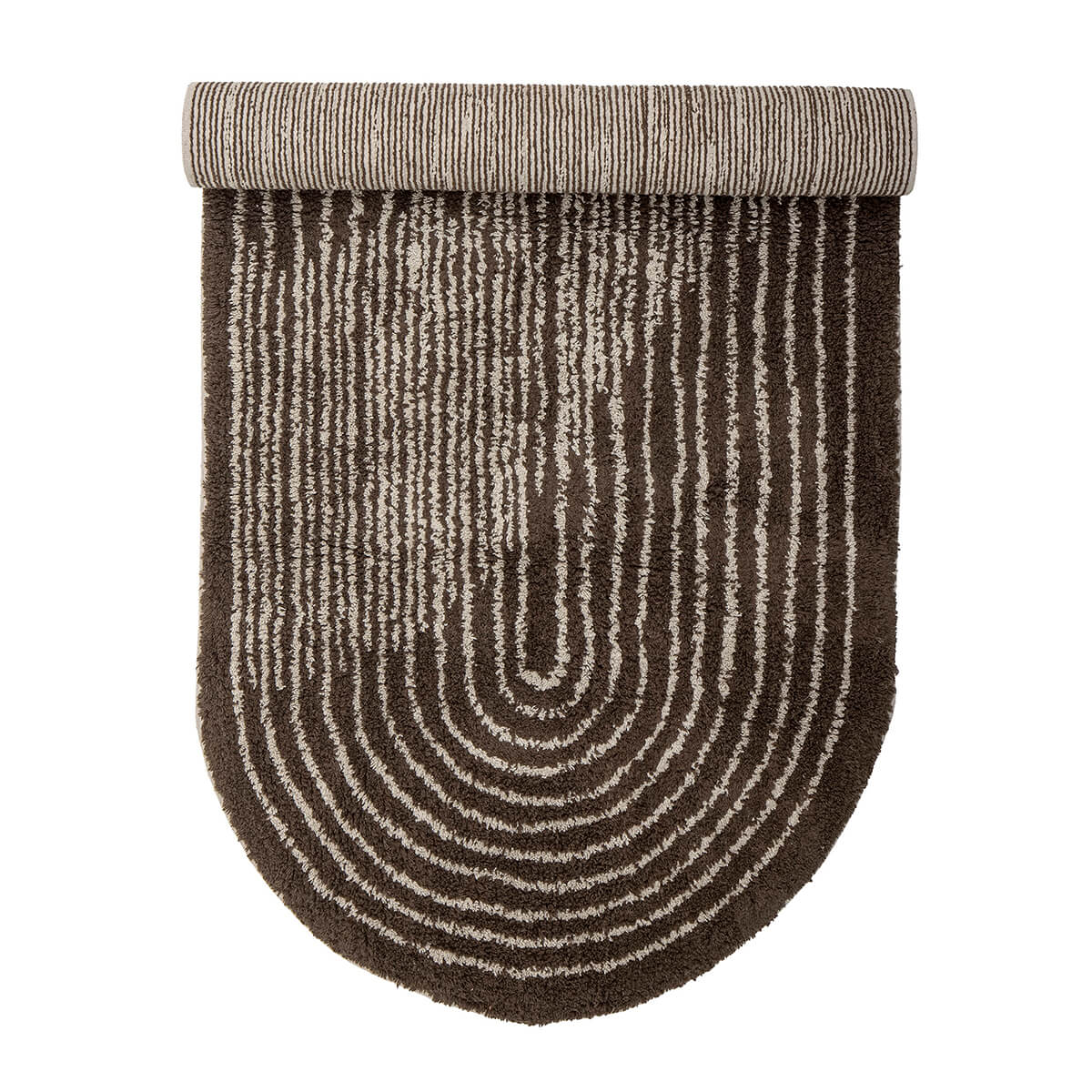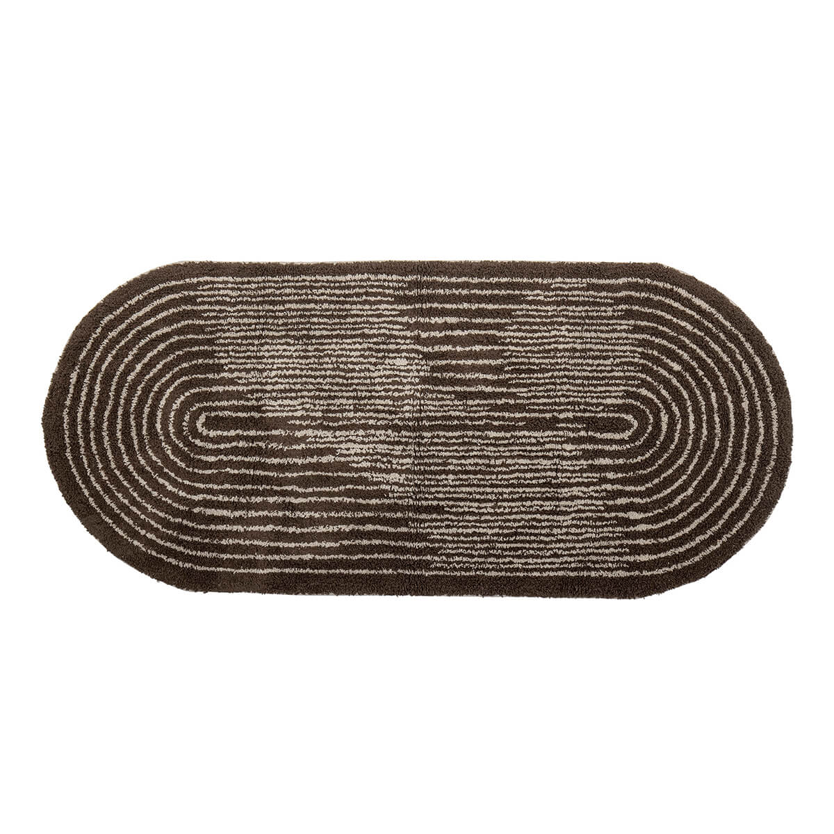Oválný koberec z bavlny v teplé tmavě hnědé barvě s všívaným vzorem.