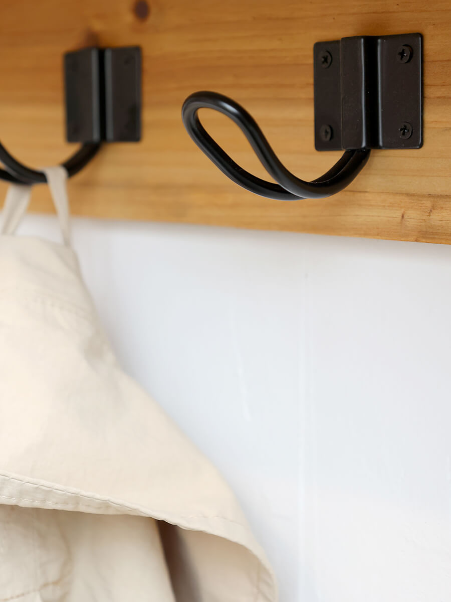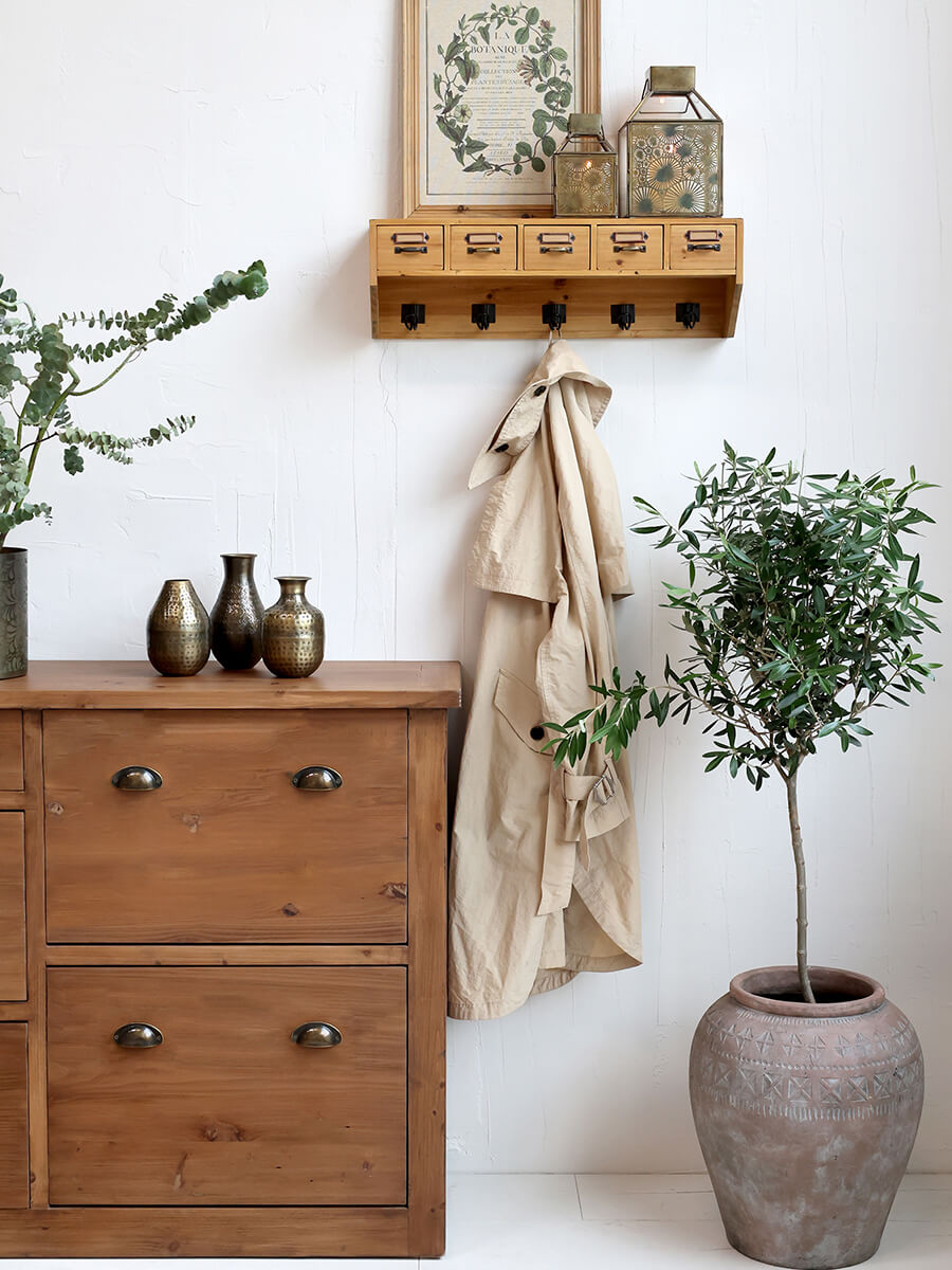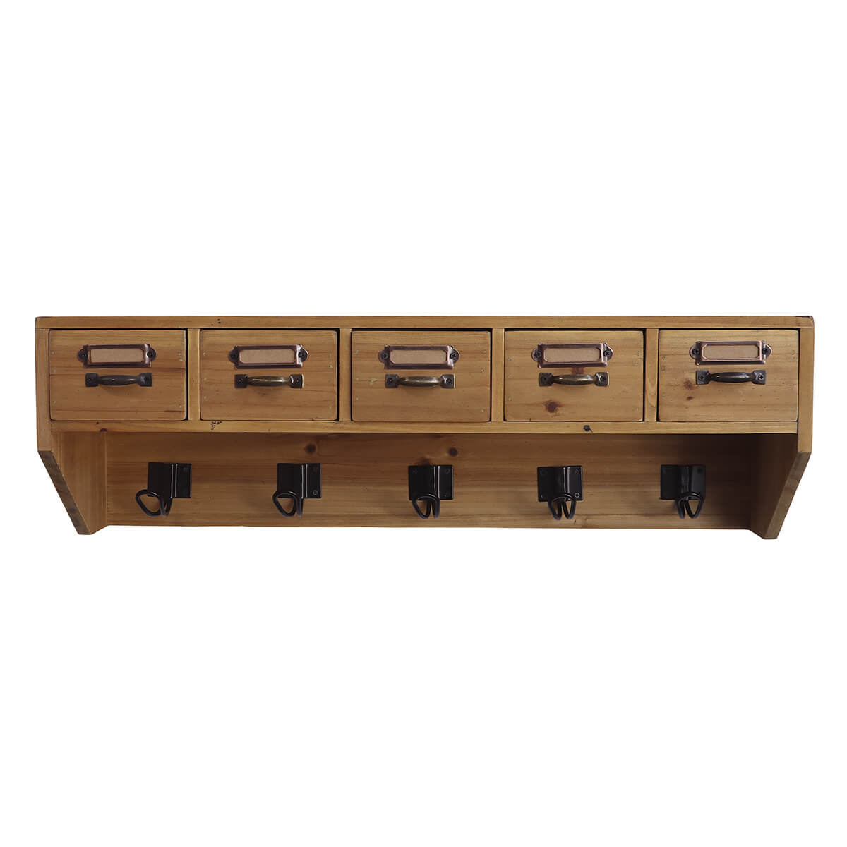 Nástěnná police s 5 háčky a úložný prostor se zásuvkami Chic Antique. Černé kovové doplňky vyrobené z přírodního jedlového dřeva vytvářejí vzrušující kontrast s teplým tónem dřeva.