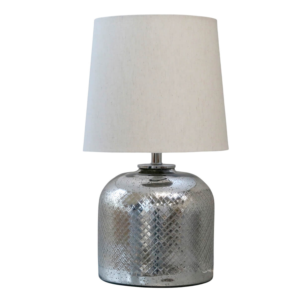 Stolní lampa ze rtuťového skla ve stříbrné barvě s diamantovým brusem. Má pěkné světlé lněné stínidlo.
