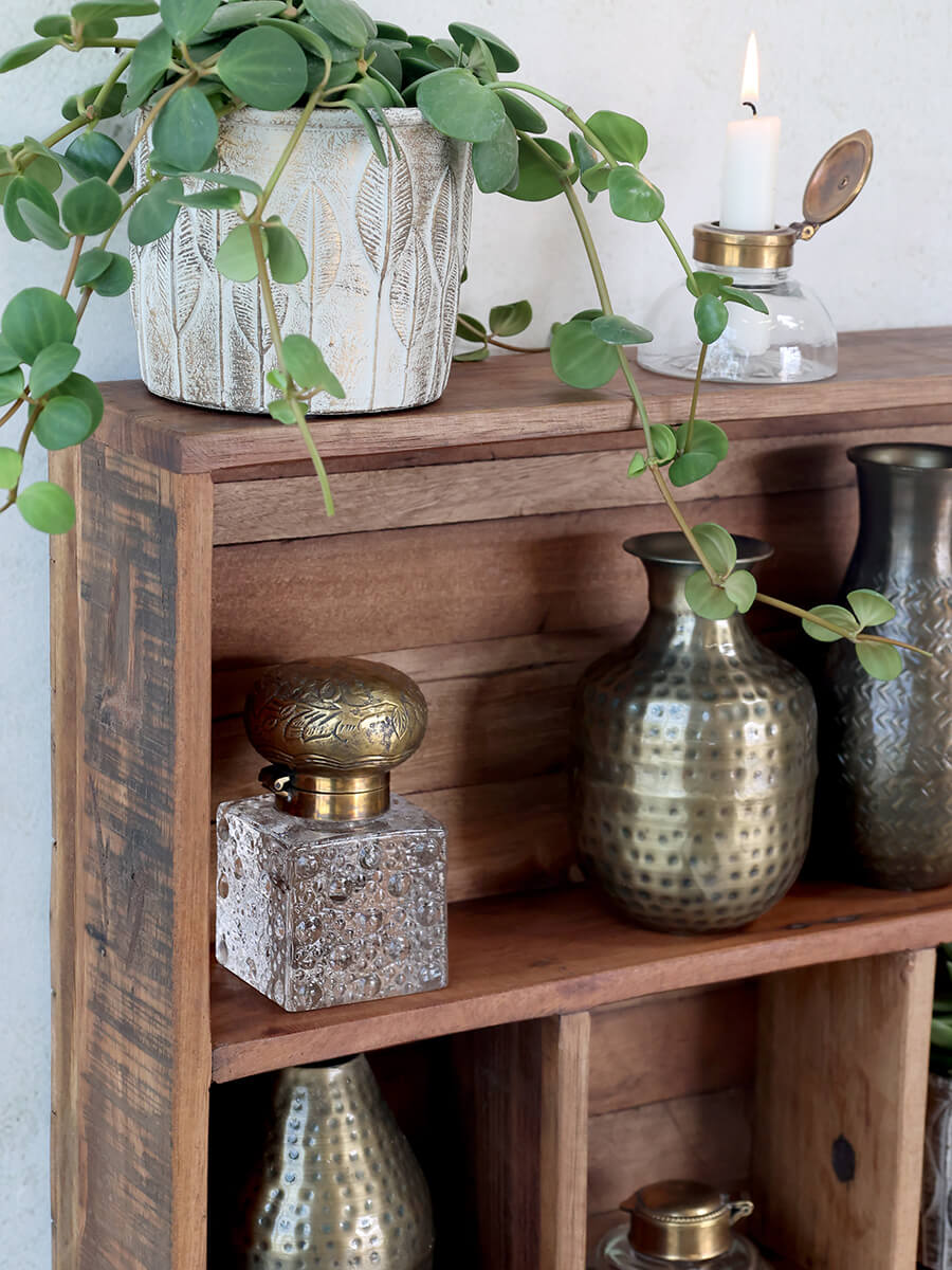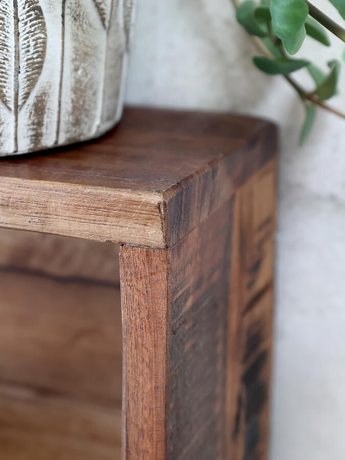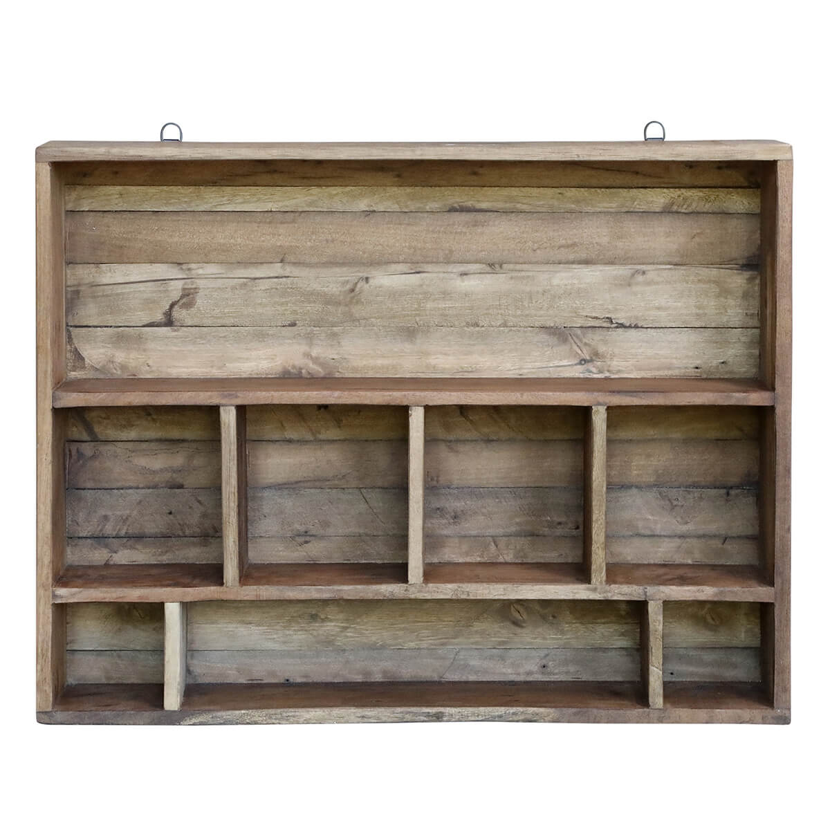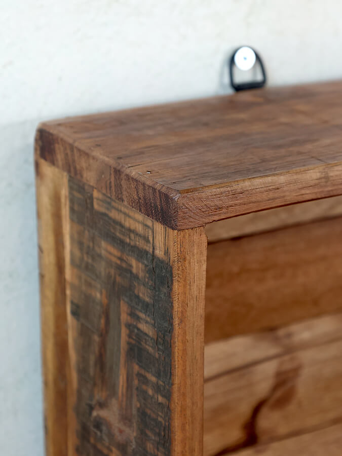Wandregal aus recyceltem Holz im Vintage-Look, das mit seinen vielen Fächern eine hervorragende Ablagefläche bietet.