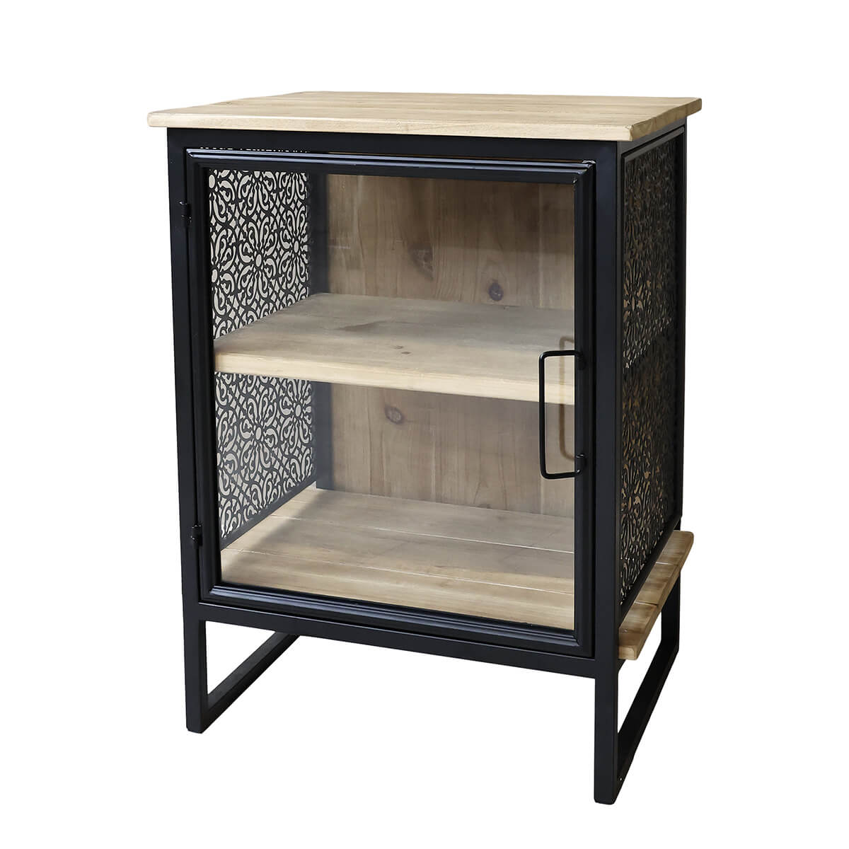 Kleines Schränkchen mit schwarzem Schnürrahmen und Einlegeböden aus natürlich hellem Tannenholz. Das kleine Möbelstück ist mit einem besonderen Spitzenmuster aus Metall verziert, seine zwei Einlegeböden können praktisch als Stauraum genutzt werden und es lässt sich mit einer Glastür schließen.
