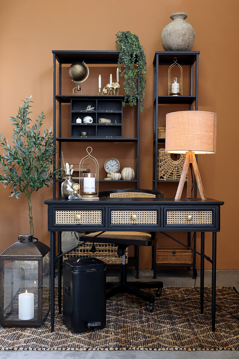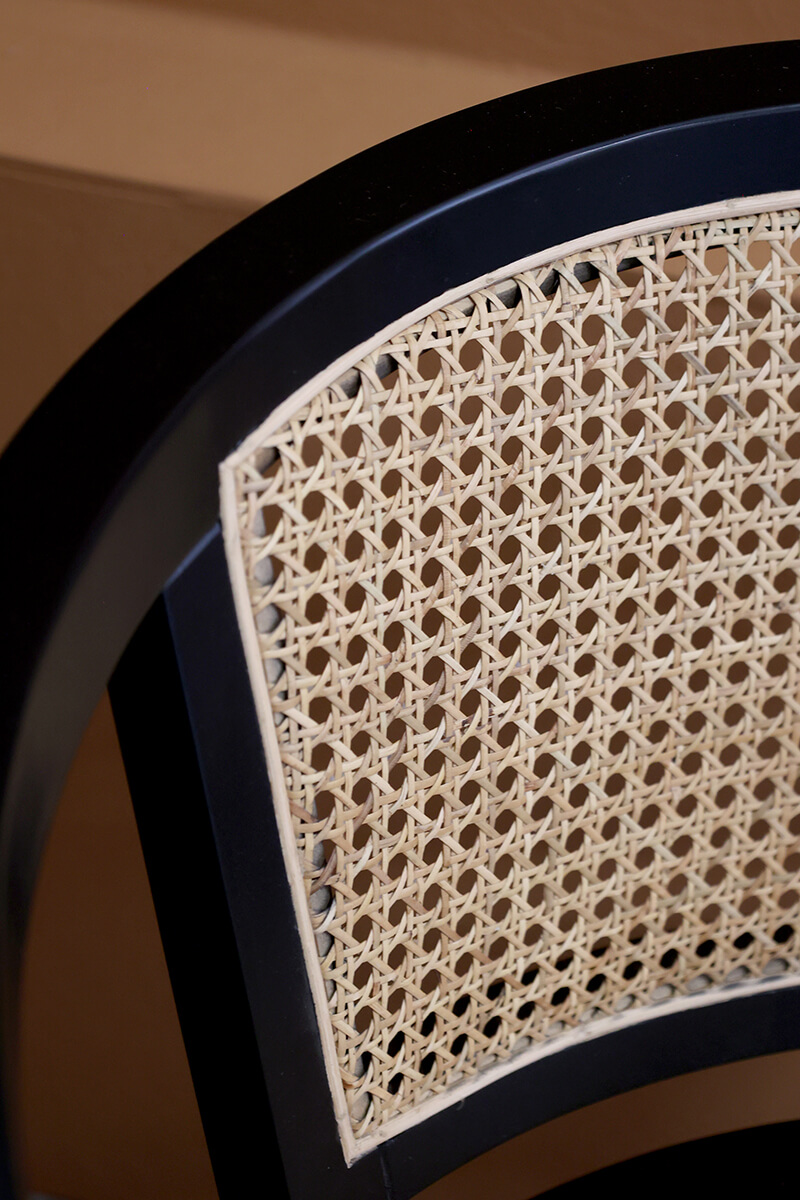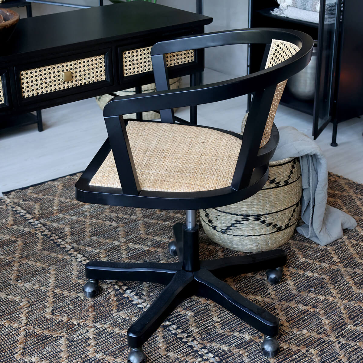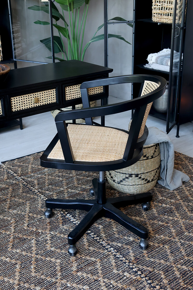 Schwarzer Bürostuhl mit Rattaneinsatz von Chic Antique. Der Kontrast von dunklen und hellen Tönen macht ihn elegant. Die monochrome Ästhetik wird durch die elegante Maserung des Birkenholzes ergänzt.