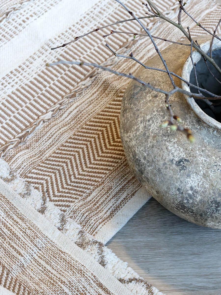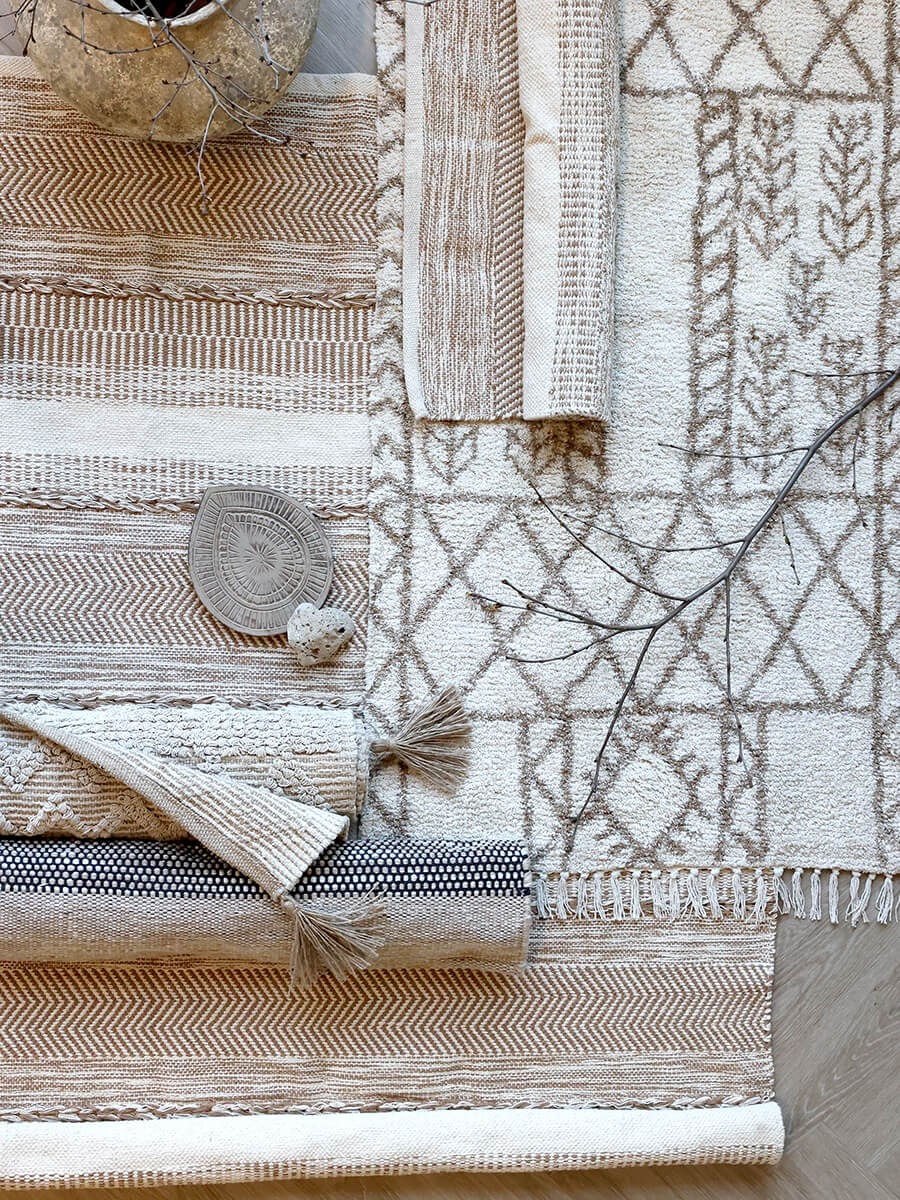 Teppich in weicher Farbe mit natürlichem Muster, hergestellt aus Baumwolle.