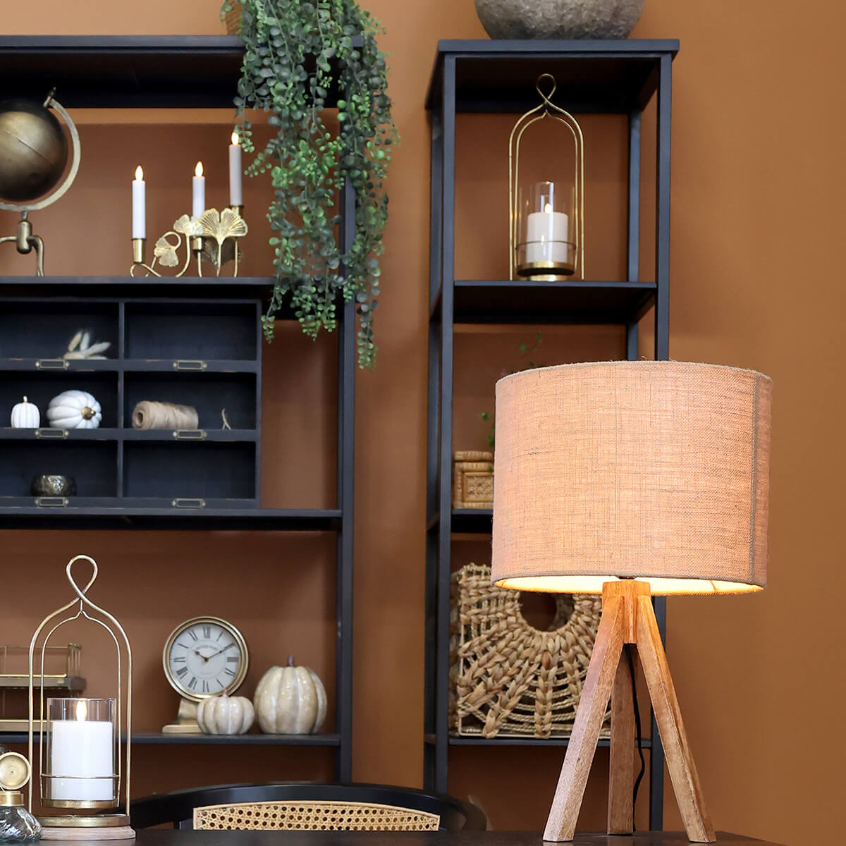 Tischleuchte aus Mangoholz auf drei Beinen mit passendem beigem Leinenschirm.