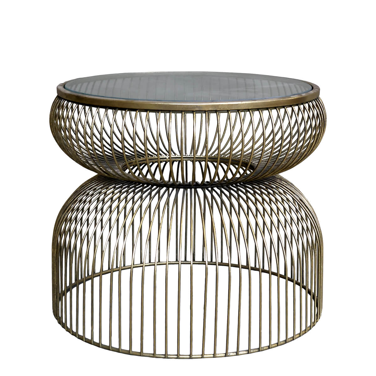 Elegante bijzettafel die een prachtige gloed in elke kamer zal brengen. Het is handgemaakt van ijzer met een antieke messing look en een licht tafelblad van glas.