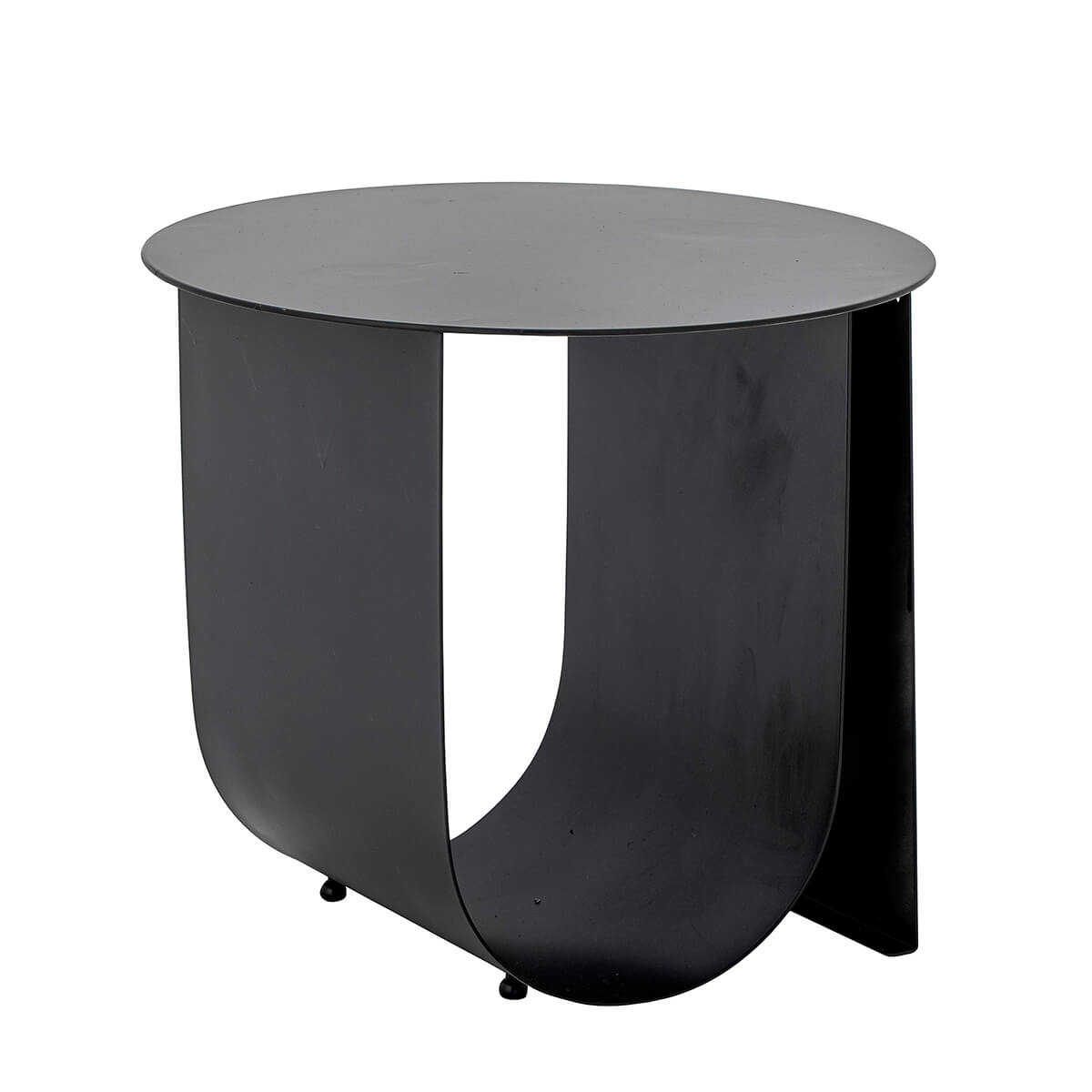 Bijzettafel in zwart met rond tafelblad van metaal. De ruimte onder de tafel is ideaal voor het opbergen van tijdschriften, boeken of kleden, waardoor het een multifunctionele en stijlvolle aanvulling is voor elk huis.