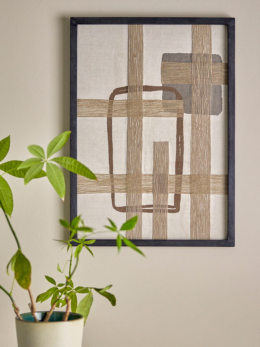 Bruin Katoenen Wanddecoratie van Bloomingville met ingetogen tinten en een spannend gestructureerd oppervlak. De wanddecoratie zit in een zwart, strak frame, dat een strakke en minimalistische uitdrukking geeft aan het opvallende ontwerp.