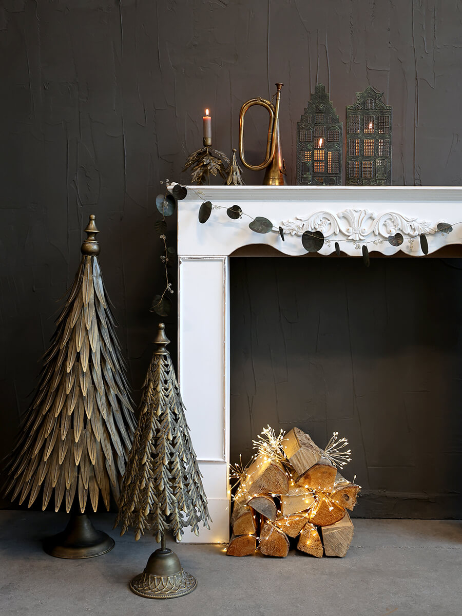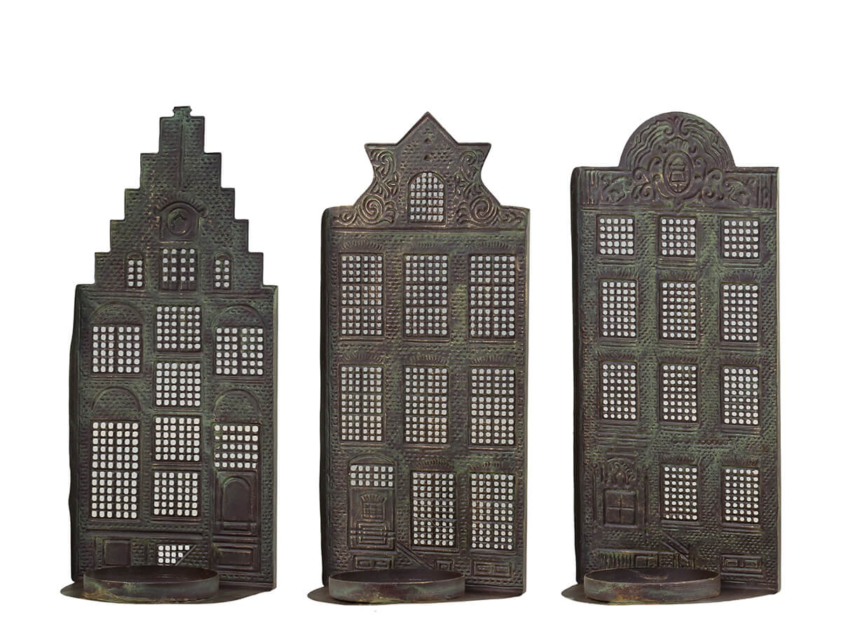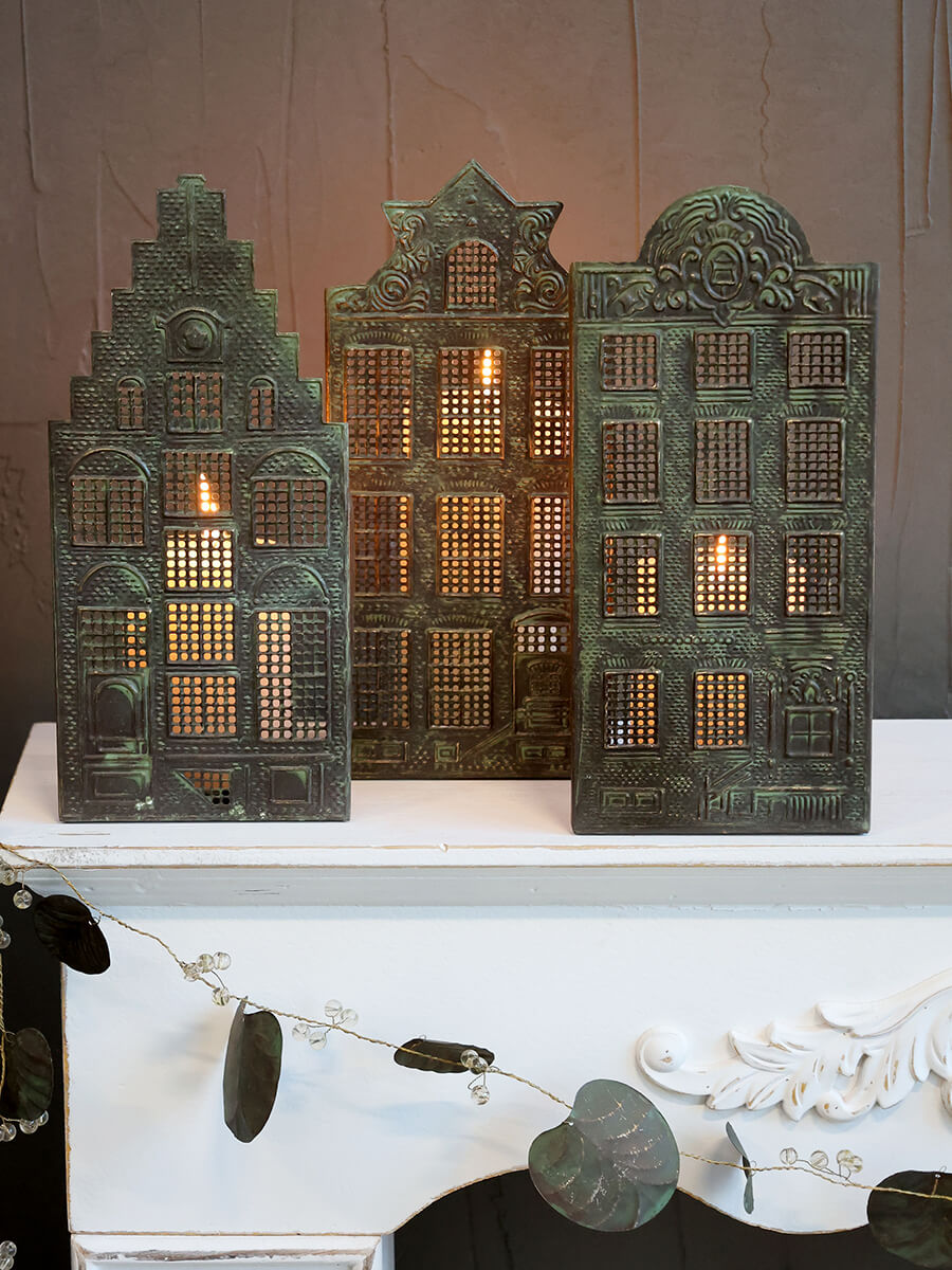 Kandelaar van metaal in antiek messing met de vorm van een huis dat bekend is uit de Nederlandse architectuur. Plaats de kaars of een waxinelichtje aan de achterkant, het licht filtert prachtig door de ramen.