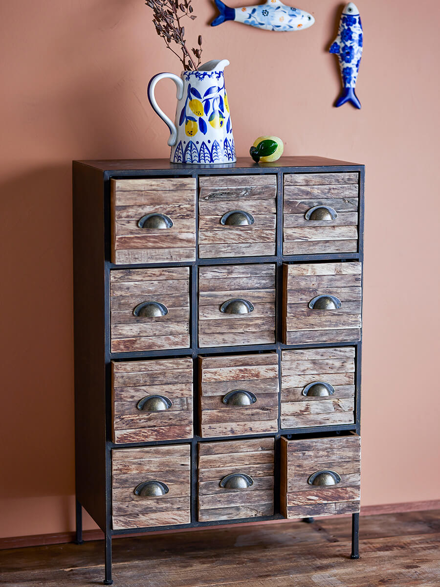 Ladekast in industriële stijl met een rustieke uitstraling. Hij heeft 12 ruime lades die alles van kleine spullen tot kantoorbenodigdheden op orde houden.