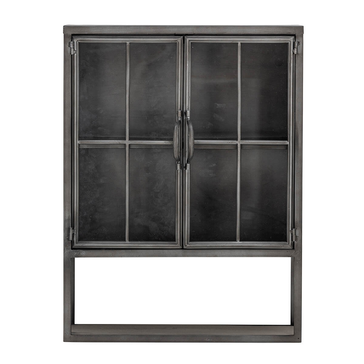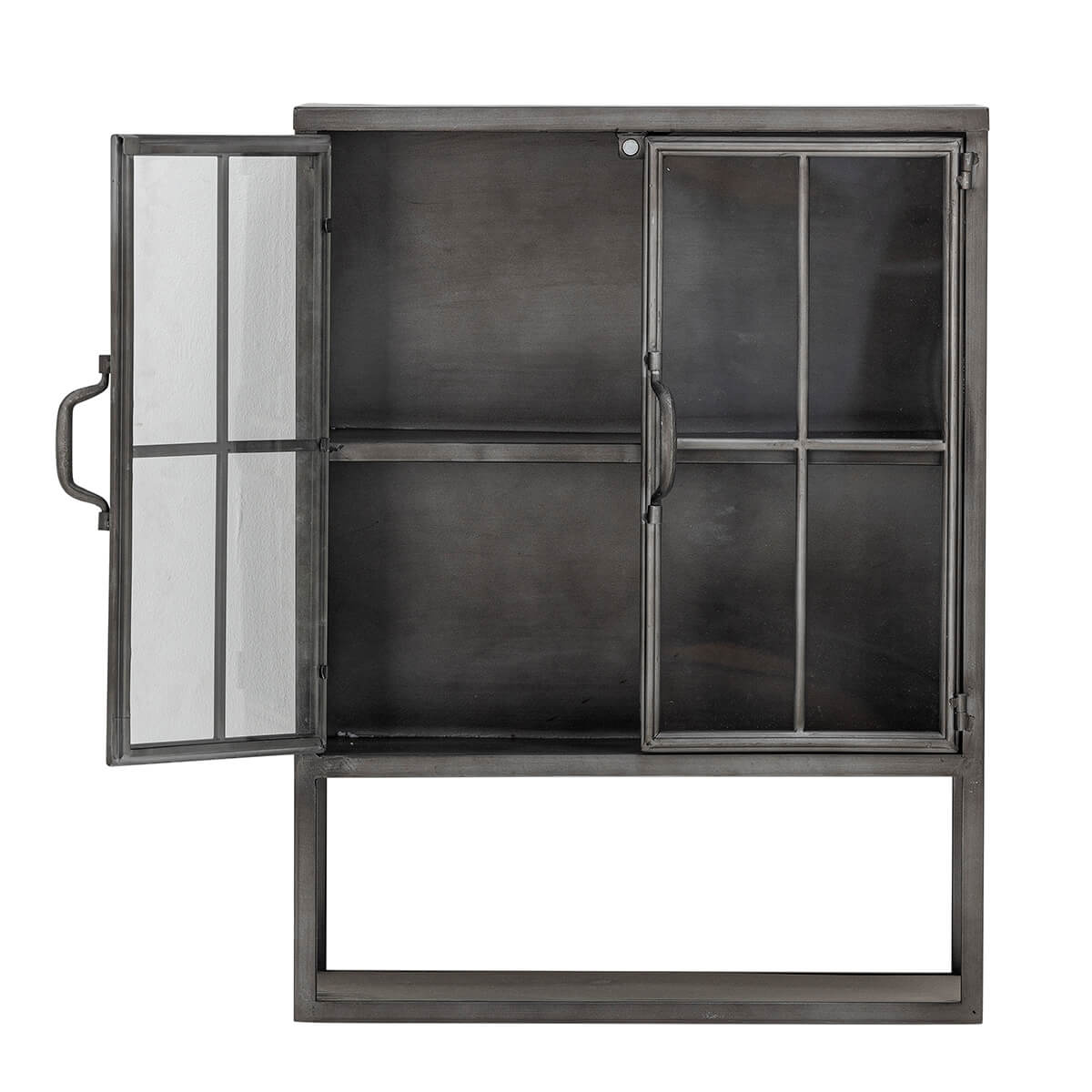 Czarna metalowa szafka w stylu industrialnym, którą można powiesić na ścianie lub wykorzystać jako półkę na stole. Szklane drzwi skrywają dwie półki, które idealnie nadają się do eksponowania przedmiotów dekoracyjnych w salonie lub do przechowywania talerzy i kubków w kuchni.