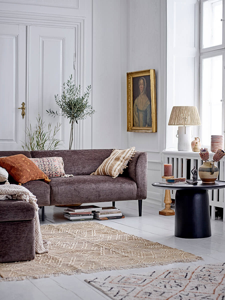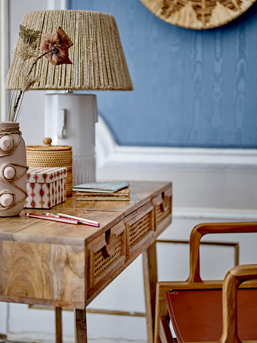 Lampa stołowa marki Bloomingville, która nie tylko rozjaśni ciemne kąty, ale również posłuży jako dekoracja. Abażur wykonany jest z jutowych sznurków, które kontrastują z niesamowitą kamionkową podstawą ozdobioną kształtem twarzy.