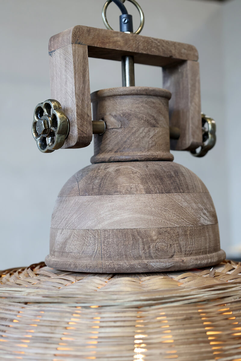 Rattanowa lampa wisząca z wiklinowym wzorem i podstawą z drewna mango. Wykonana z naturalnego materiału lampa o zakrzywionym kształcie zapewnia przytulne oświetlenie w salonie, sypialni lub jadalni.