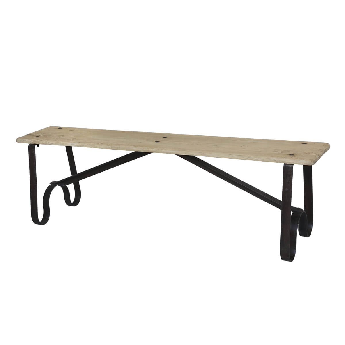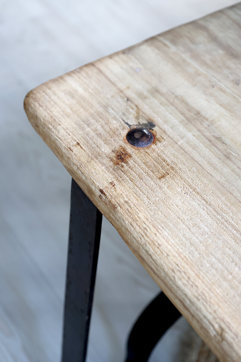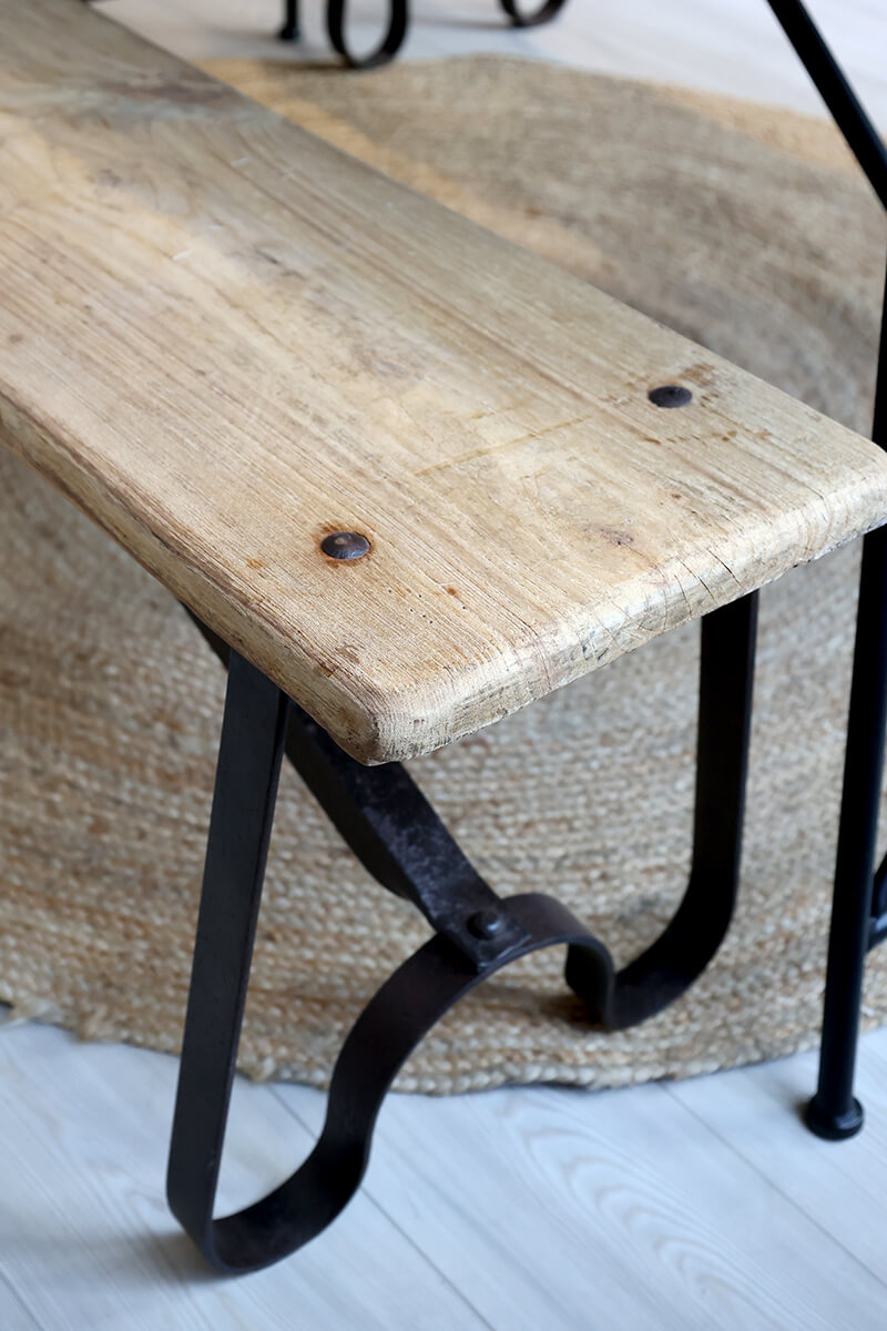 Ławka Grimaud z metalowymi nogami od Chic Antique. Jasny odcień drewna i czarne metalowe nogi tworzą ekscytujący kontrast, a siedzisko z naturalnego drewna jest wyjątkowe dzięki unikalnemu kształtowi metalowych nóg.
