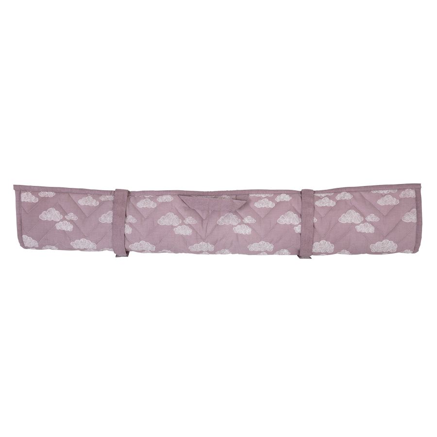 Miękka mata do zabawy dla dzieci STANDARD 100 by OEKO-TEX® na piknik lub do domu. Różowa, z wzorem spadającego króliczka i chmurkami na plecach. Można ją zwinąć i łatwo przenosić.