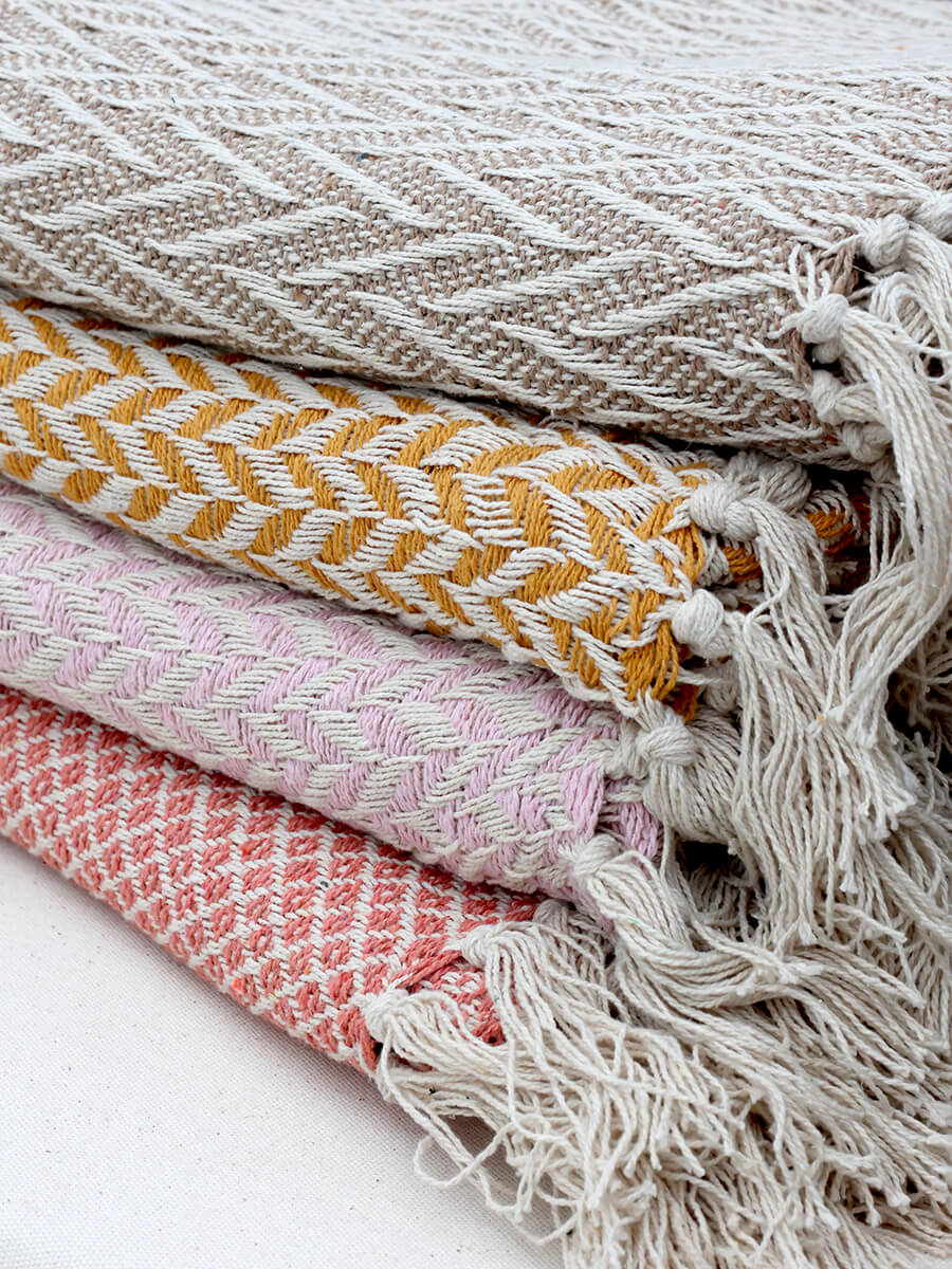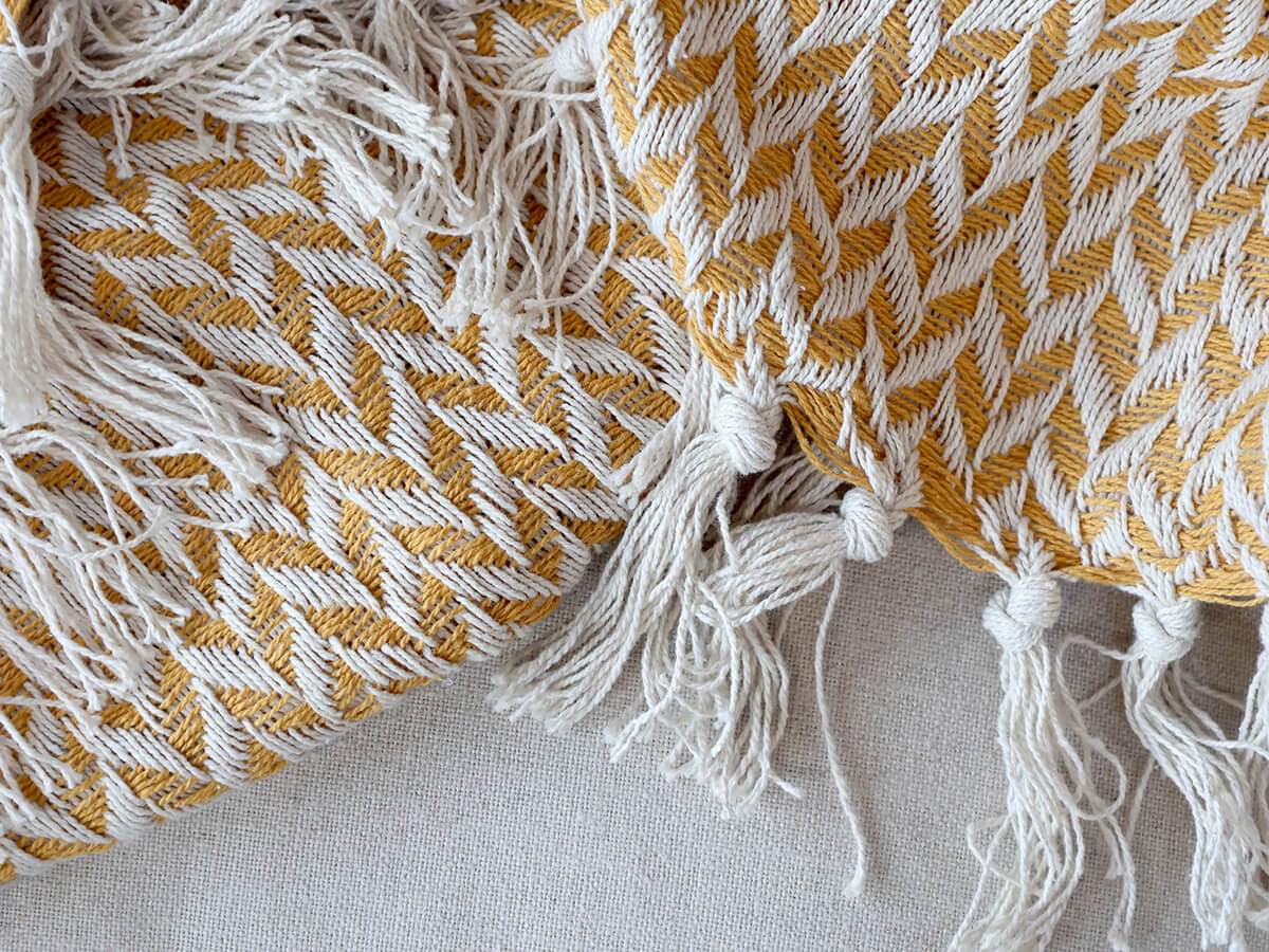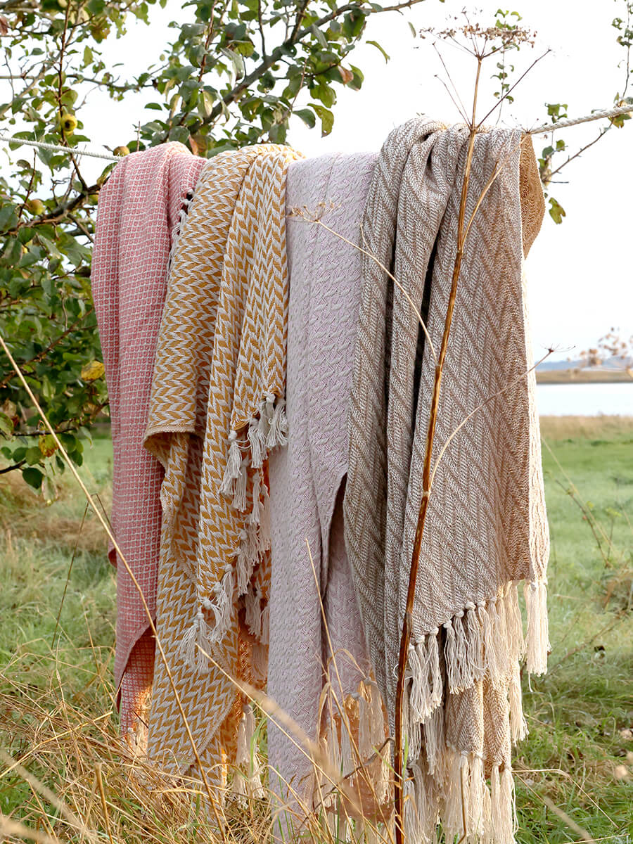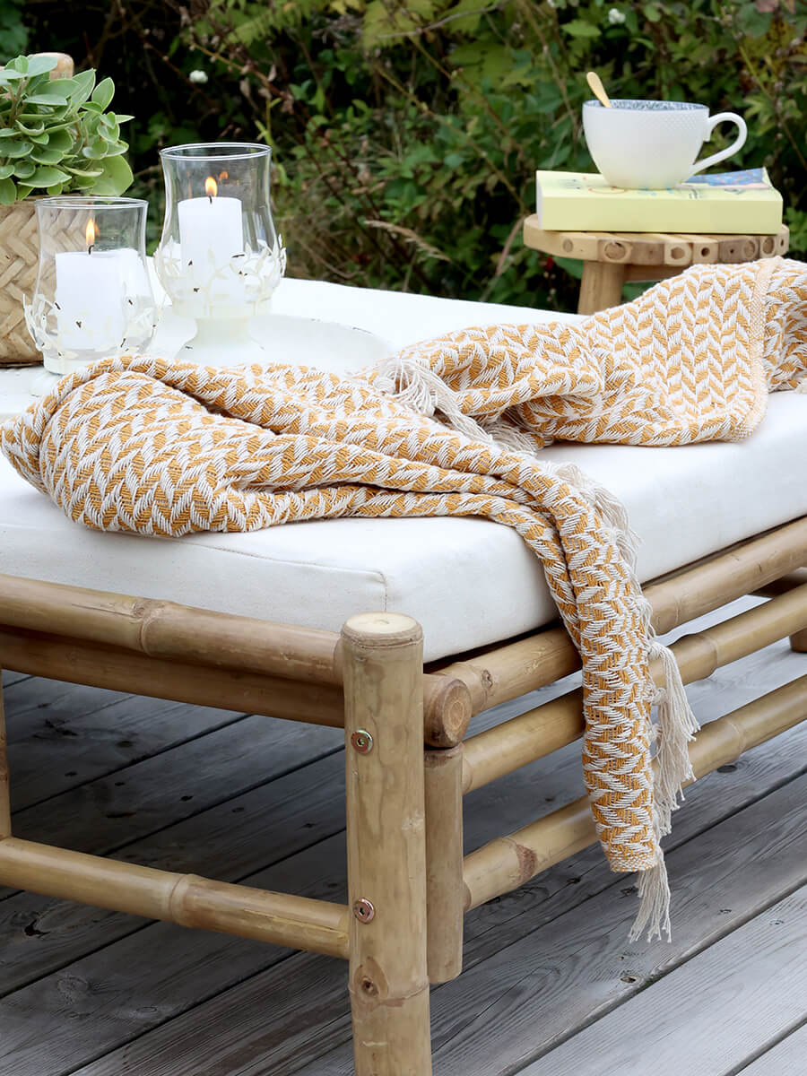 Miodowo-złoty bawełniany koc o subtelnym odcieniu, który dobrze pasuje do domów w stylu nordyckim.