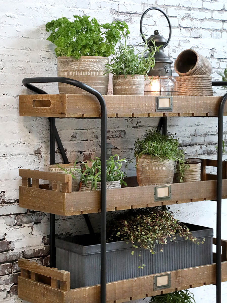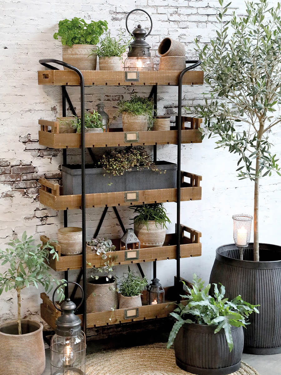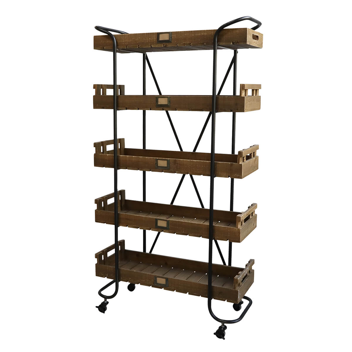 Vintage flower stand with carts. Place your plants or other decorations on 5 shelves, creating a beautiful atmosphere. Thanks to its wheels it can be easily moved.