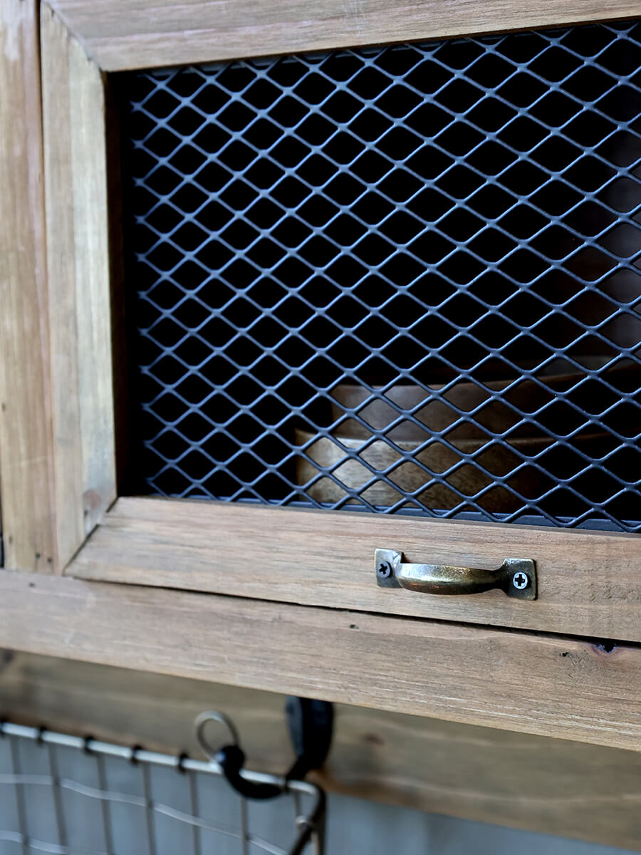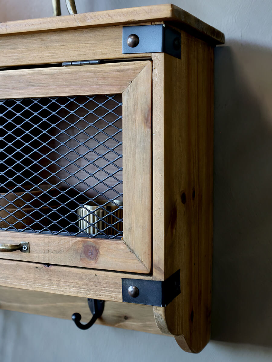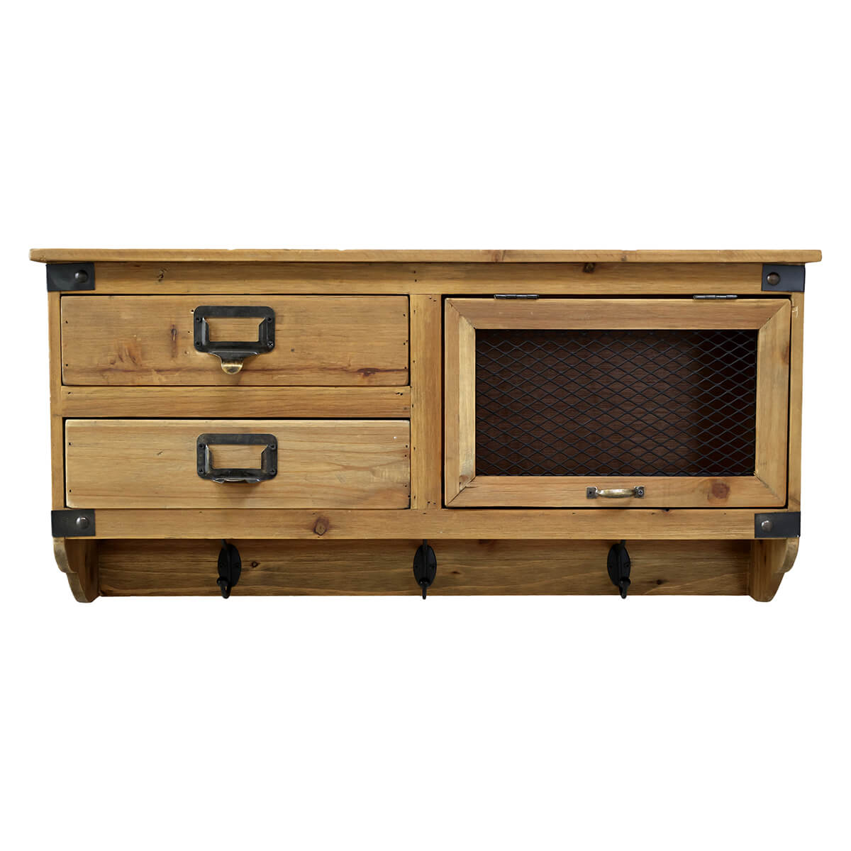 Shelf with 2 drawers and three hangers by Chic Antique. It has a shelf on top, two small drawers, an upward-opening cabinet with a mesh front, and finally, three hooks.