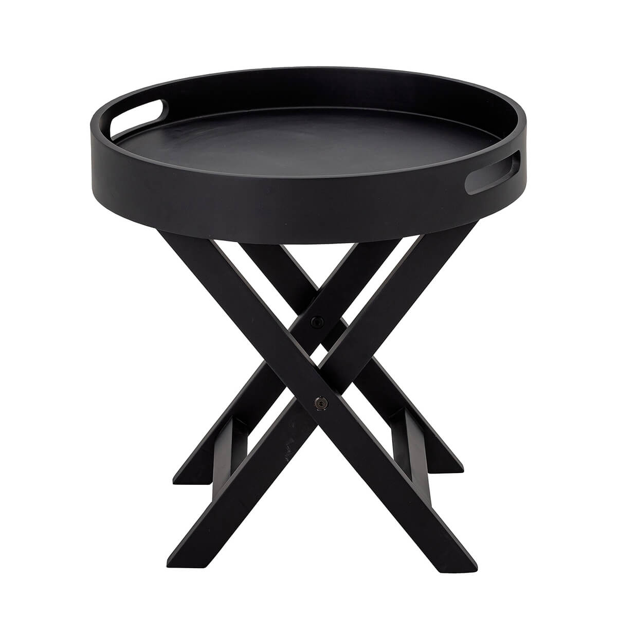 Masă laterală din lemn de cauciuc de culoare neagră, cu un blat rotunjit.