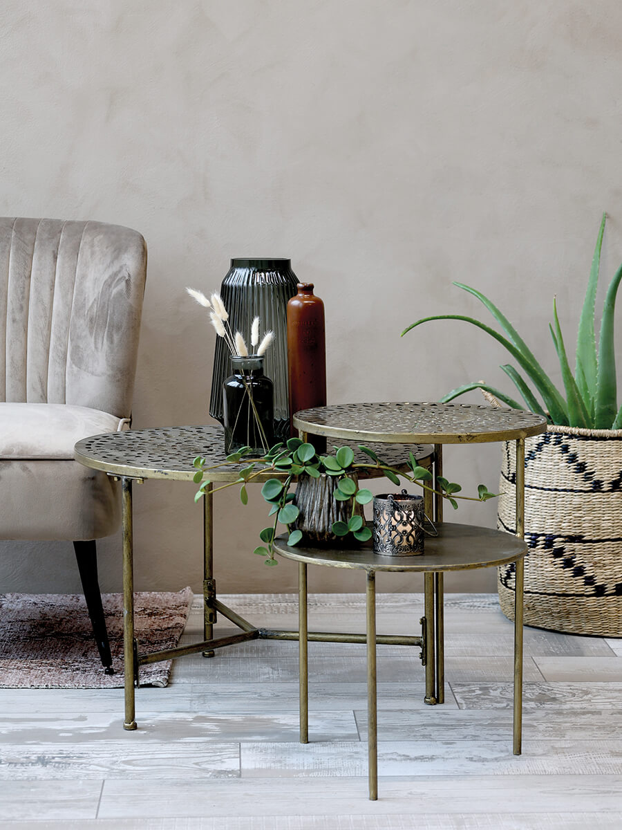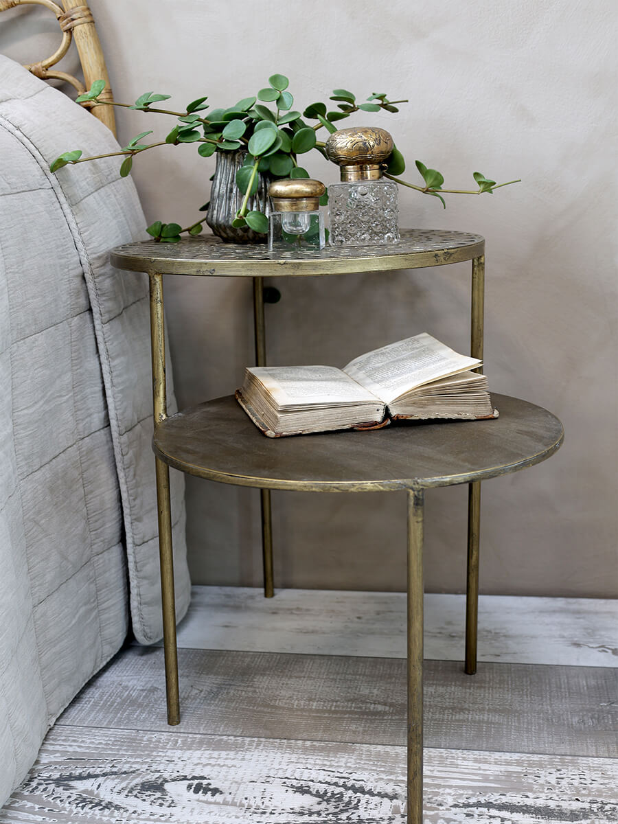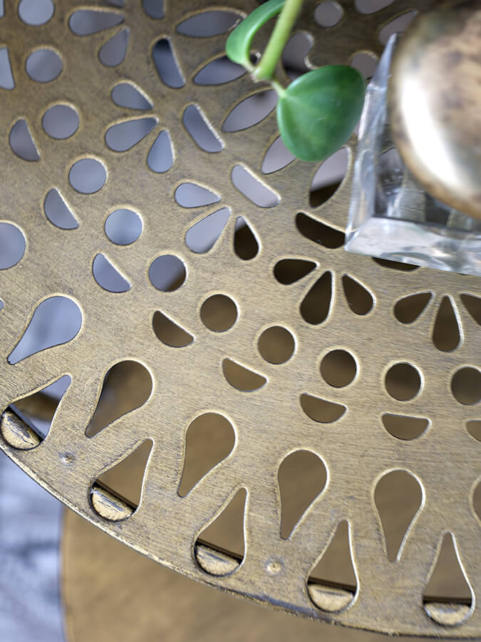 Okrogla kavna mizica v barvi antične medenine, izdelana iz kovine. Njena posebnost je, da je sestavljena iz kompleta, tako da se skupaj pritrdita dve mizni plošči. To omogoča zračen in lahkoten videz. Njena zgornja mizna plošča ima čudovit vzorec, spodnja mizna plošča pa je iz masivne površine.