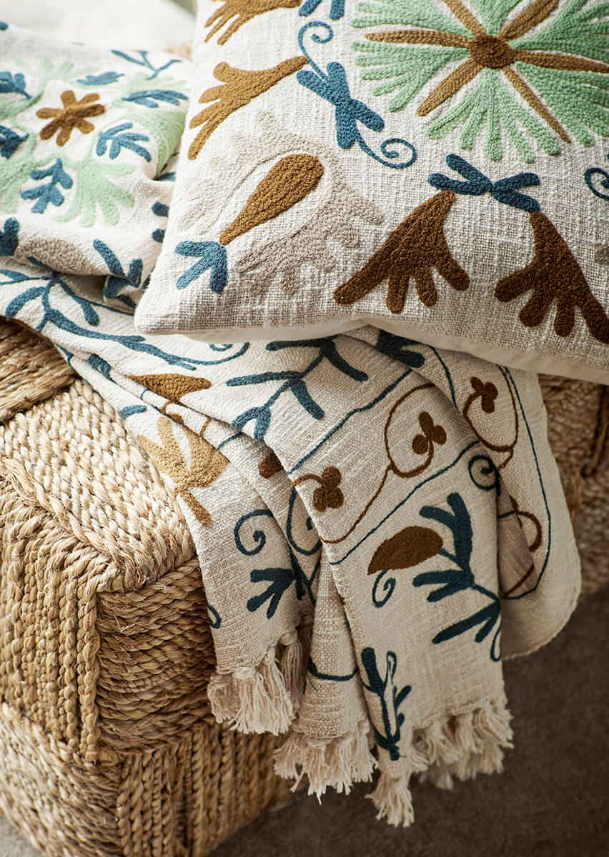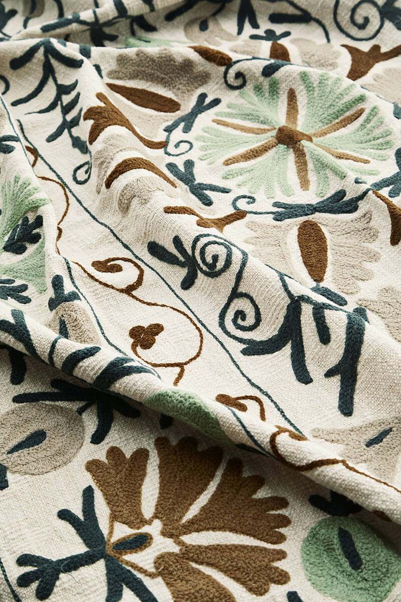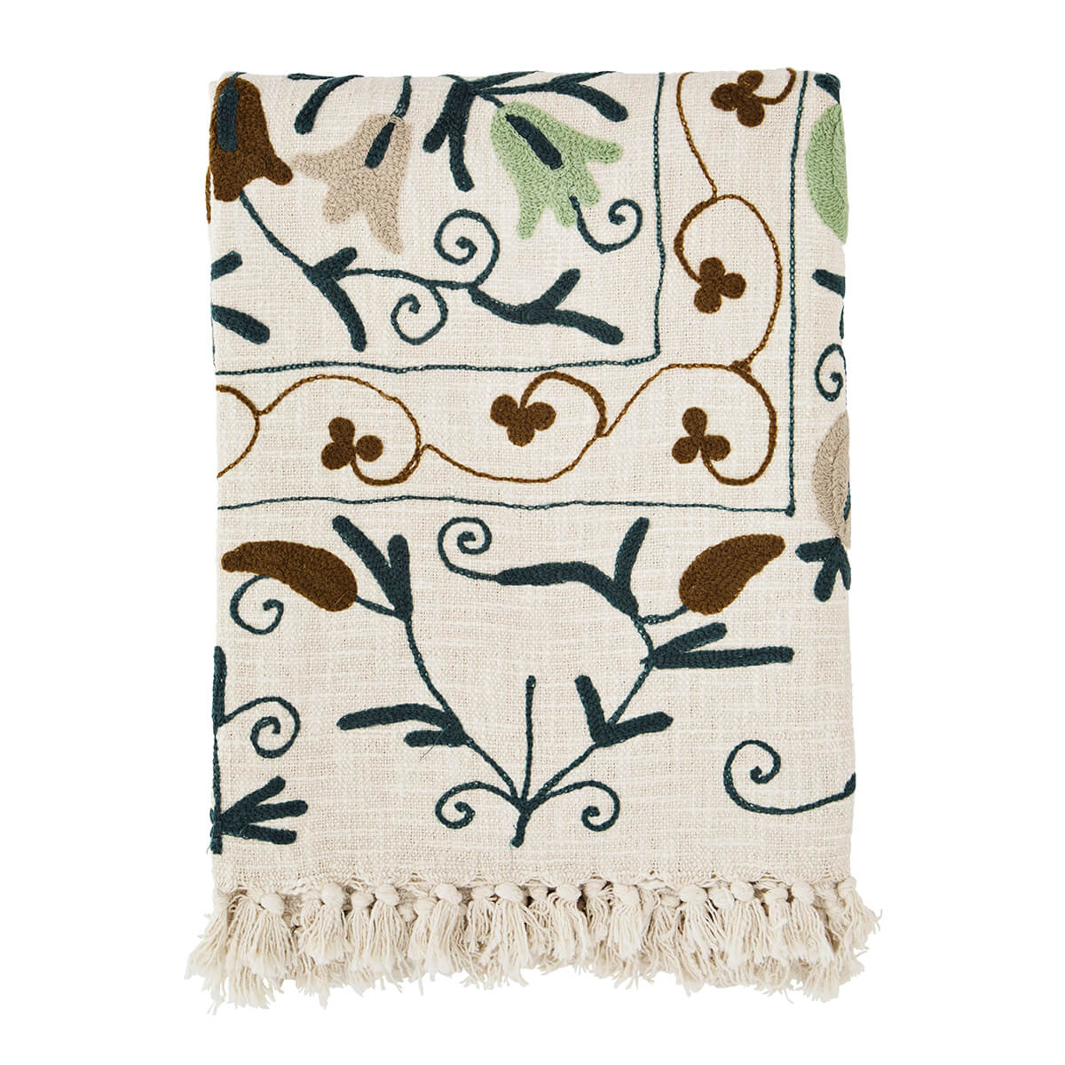 Vezena bombažna odeja Suzani - zelena, vrhunski domači tekstil Madam Stoltz, okrašen s posebnimi, zemeljskimi barvami in živahno perzijsko vezenino.